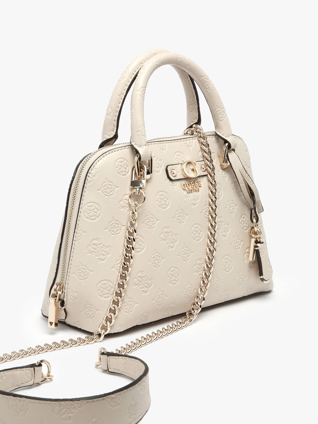 The DITA GUESS handbag, made of P.U., combines style and practicality for your daily use. The exterior features a secure zip closure and a back pocket, perfect for quick access to essentials. With an 8 cm handle height, it can be carried elegantly by hand, while its removable strap offers the option to wear it crossbody. Inside, the bag has one main compartment, complemented by two simple pockets and one zippered pocket for efficient organization of personal items. The DITA GUESS is a perfect choice to blend elegance and functionality every day.