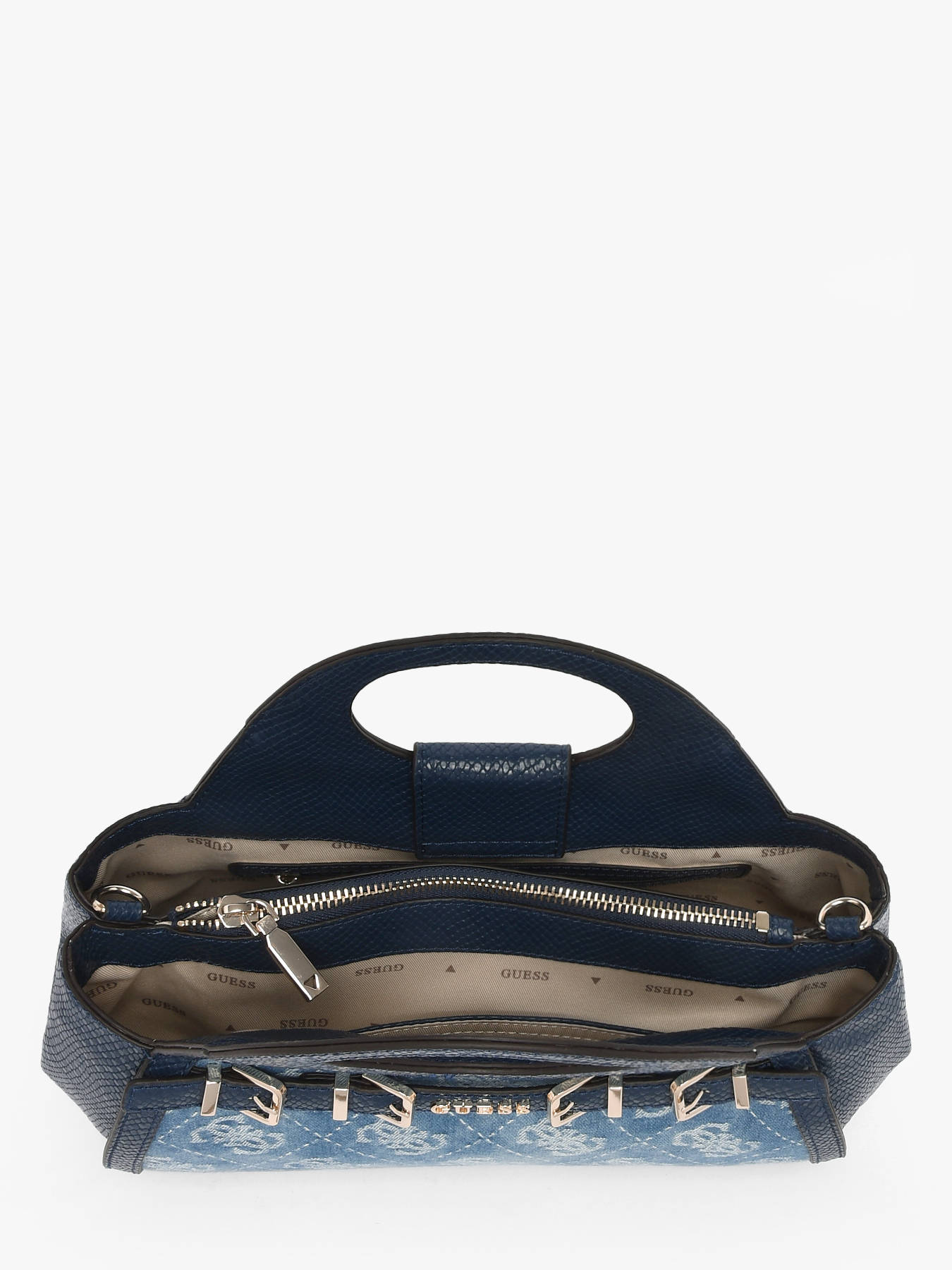 The DOVIE GUESS handbag in cotton with coated canvas trim combines elegance, style, and practicality. Its zip, flap, and magnetic closure keeps your belongings secure while providing quick access to essentials. Inside, three compartments, one zip pocket, and one slip pocket offer organized storage for your items. On the outside, a back pocket provides convenient access to must-have belongings. The adjustable and detachable strap allows it to be carried by hand or crossbody according to your preference, while the 8 cm handle height ensures optimal comfort. Compact and structured, this bag perfectly complements urban or sophisticated looks, adding a chic and contemporary touch to any outfit. Every detail, from the quality cotton and coated canvas to the refined finishes, reflects GUESS’s craftsmanship, making this bag a trendy, practical, and elegant accessory for everyday use.