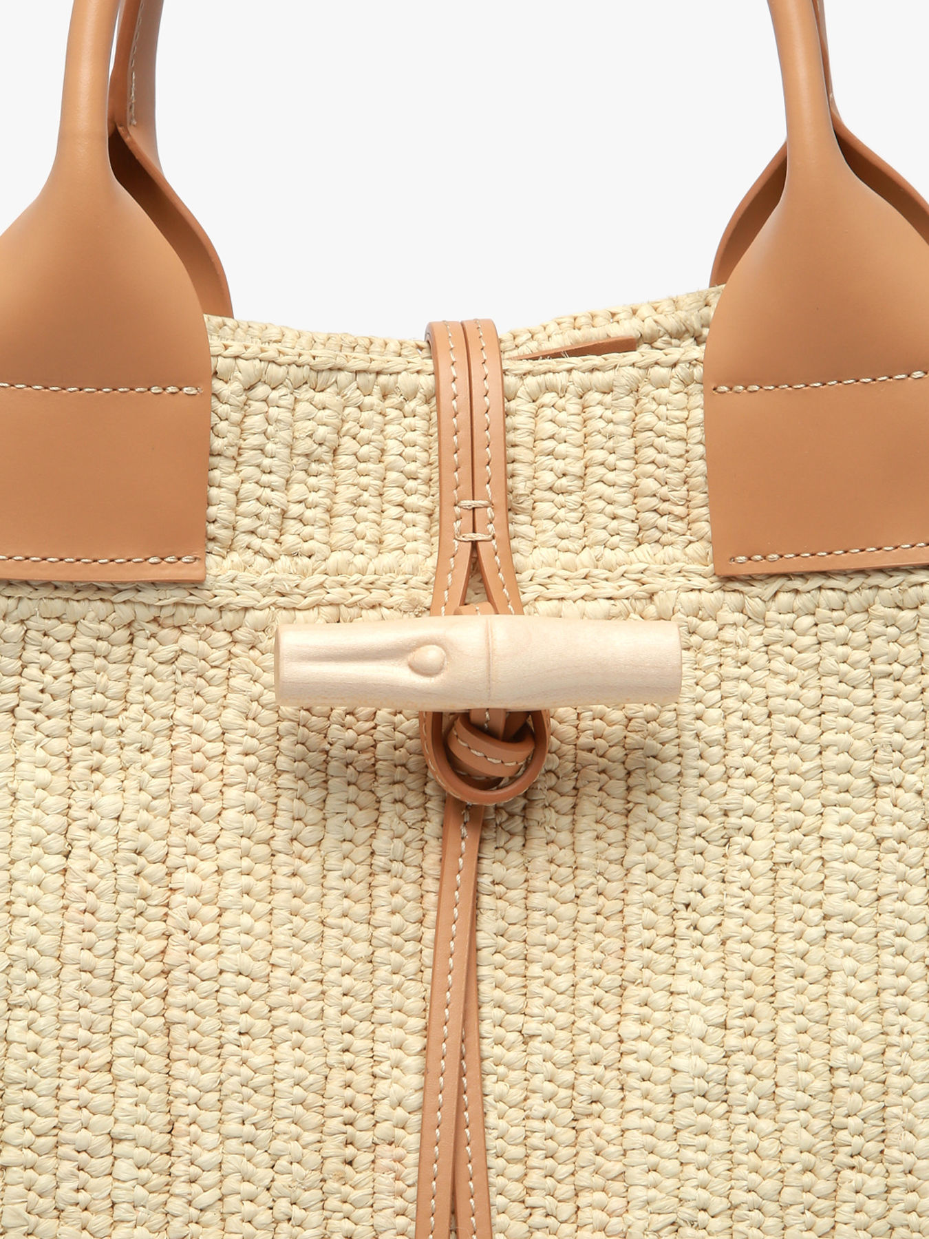 The Le Roseau L Tote Bag LONGCHAMP is an iconic piece combining craftsmanship, elegance, and social commitment. Handwoven in raffia using traditional crochet techniques, it is made in collaboration with Anaka, an NGO supporting female artisans in Madagascar. Every detail is carefully designed: calf leather finishes, vegetable-tanned leather handles with visible stitching, and the signature bamboo clasp carved from maple wood, tied with a leather cord, adding a natural and distinctive touch. With a 14 cm handle height, it is comfortable to carry by hand, and the interior features a single compartment with an embossed seasonal logo label. The Le Roseau tote perfectly embodies authenticity, style, and functionality, making it ideal for refined summer days or to elevate your outfits with a handmade, sustainable accent.