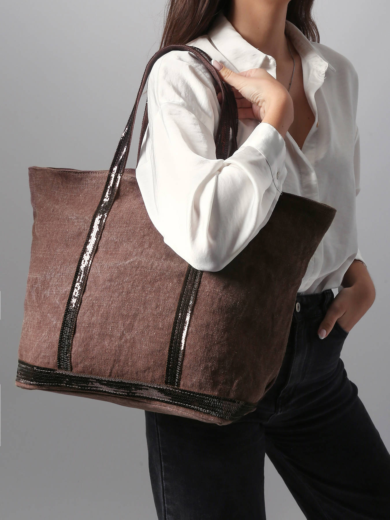 This linnen version of the legendary Le Cabas tote bag by Vanessa Bruno is highly durable and lightweight. The waterproof linnen material is finished with sequin shoulder straps. The bag closes with a zipper and has a central inside pocket. It also features a small inside zipped pocket, which is topped off with a leather label ""Le Cabas Vanessa Bruno made in France"".